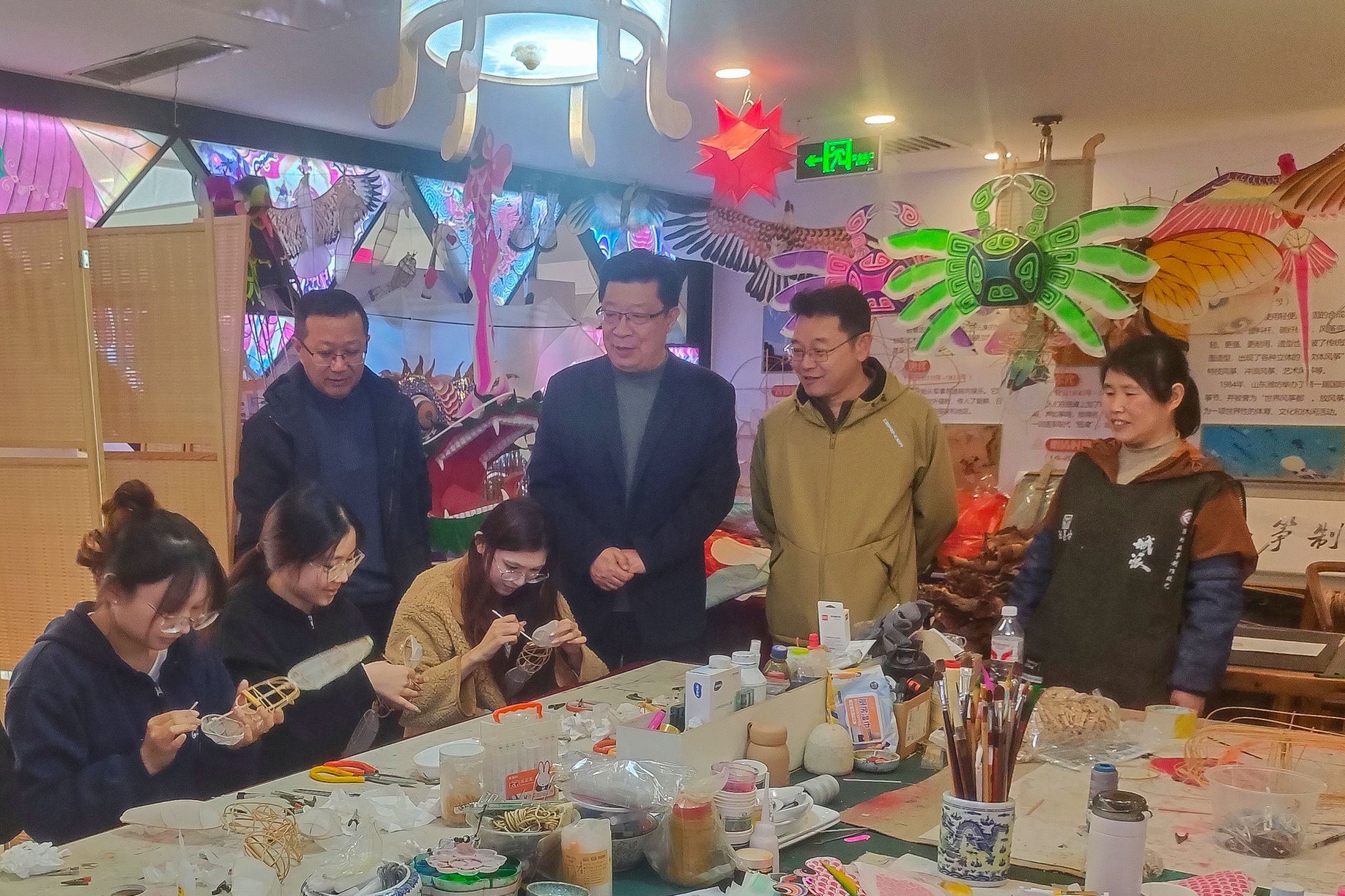 考察期间,学院一行现场观摩潍县风筝制作全流程,非遗传承人详细介绍了风筝的历史渊源、特色内涵,以及扎制、裱糊、绘制三大核心工序,并现场演示关键制作步骤、逐一解答相关疑问。我院主要负责同志与传承人围绕非遗技艺融入课堂教学展开深入交流,随后实地参观工坊制作区与产品展示区,与正在开展实践创作的动漫专业师生亲切交流,详细了解其实践推进情况与学习收获。此前,师生们已在非遗传承人的专业指导下,系统参与潍县风筝制作实践,深入学习扎制、裱糊、绘制等核心技艺。实践创作期间,师生们还将参与第 43 届潍坊世界风筝会、潍坊世界风筝博物馆、1532 产业园区潍坊市非物质文化遗产馆体验、风筝放飞比赛等系列活动,助力潍县风筝非遗文化的传播与推广。